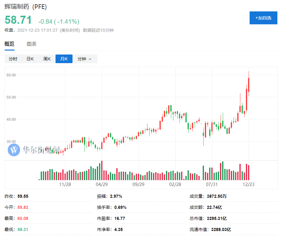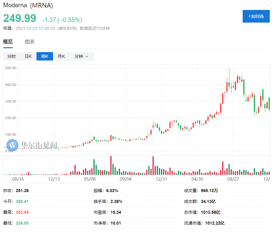 亮眼的销售业绩也助力了疫苗巨头们股价在今年一飞冲天,截至发稿,辉瑞的股价已经来到了58.71美元的历史新高,总市值突破3200亿美元;Moderna 的股价也在今年暴涨了10倍以上。