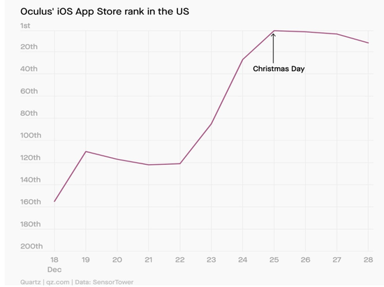 根据应用分析公司 Sensor Tower 的数据,在12月21日至27日期间,Oculus 在苹果和Android两个主要应用市场的全球下载量达到了 130 万次,新下载量每周增长 363%。从Oculus应用程序推出至今的5年来,Sensor Tower 共统计了约1300 万次的下载量,这也就是说,Oculus有10%的下载量都来自于过去一周。