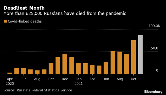 11月是俄罗斯新冠疫情爆发以来死亡人数最多的一个月,进一步加剧该国的人口危机。俄罗斯总统普京认为,人口危机是影响该国未来的最大威胁。根据联邦统计局周四发布的数据,上个月与新冠病毒相关的死亡人数达到创纪录的87,527人,比前一个月增加了16%,自疫情爆发以来,俄罗斯的新冠死亡总人数超过了625000人。