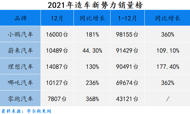 第三名为理想汽车,2021年1月至12月,理想ONE总计交付90491台,同比2020年增长177.4%;2021年12月,理想汽车交付14087台理想ONE。自交付以来,理想ONE累计交付量已达124088台。