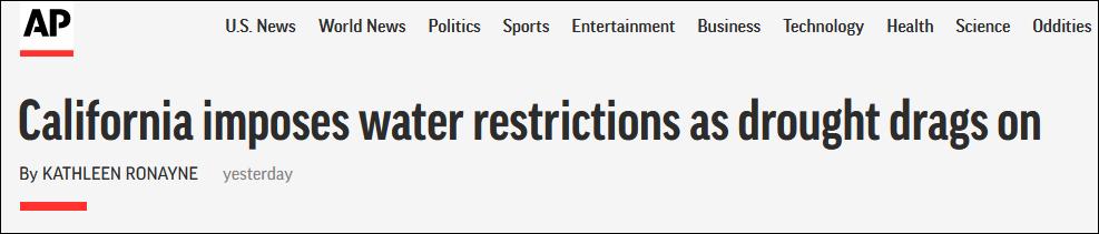 综合美联社及加州当地媒体“Callmatters”4日报道,加州水资源管理委员会当天通过了新的限水规定,对当地居民一系列用水行为施加限制。例如:在暴雨过后48小时内,禁止给草坪等美化景观浇水;禁止使用没有关闭阀门的软管清洗汽车;禁止使用饮用水清洗车道、人行道、建筑物及天井;禁止向人工喷泉及湖泊景观内注入饮用水等。