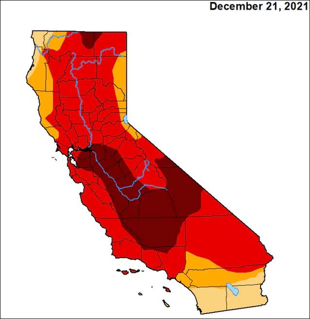12月21日,加州旱情示意图,颜色越深干旱严重程度越高(图自Deseret News)