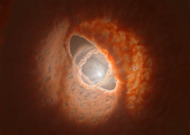 这个恒星系名叫GW Orionis(又名GW Ori),距地球约1300光年,是很合适的研究目标。三个橙色的尘埃环相互环绕,看起来宛如夜空中一颗巨大的牛眼。在这颗“牛眼”的正中央分布着三颗恒星,其中两颗属于同一个双星系统、紧密围绕着彼此旋转,另外一颗恒星则在较远处围绕着这两颗恒星旋转。在9月17日发表在《皇家天文学会月报》上的一项研究中,研究人员利用之前的数据指出,该恒星系的三个尘埃环一直摇摆不定,几乎可以肯定是由其中一个环中一颗土星大小的巨行星引起的。若经进一步研究证实,这颗巨行星将成为我们发现的首颗“环三”行星,即围绕三颗恒星旋转的行星。