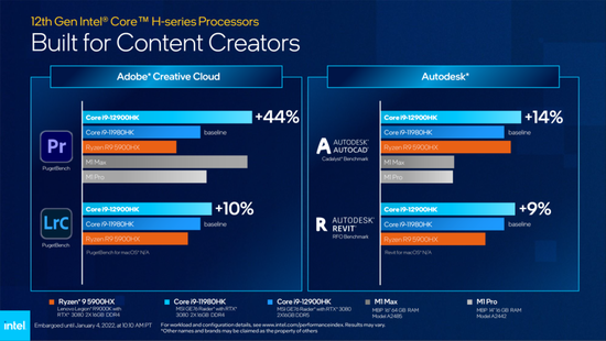 从英特尔给出的性能对比中我们可以看到,在Adobe和Autodesk的一些内容创作生产力测试中,12900HK的性能相较于AMD 5900HX领先幅度达到了44%,即使相比苹果M1 Max也有不同程度的领先。