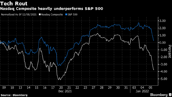 在美国科技股周三暴跌后,期货价格预示这类股票可能进一步走低。随着美国国债收益率飙升,本周以来纳斯达克综合指数市值已蒸发近1万亿美元。第一季度“将至少暂时扭转让苹果和微软等公司市值登顶全球的科技板块估值热潮,”Deuterium Capital Management全球资产配置主管John Ricciardi表示。苹果自1月3日创下3万亿美元市值最高纪录以来股价一直在下跌。