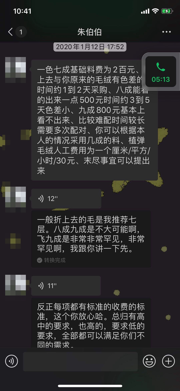 聊天记录显示,小北问朱伯明收货后不满意怎么办,是否包售后。朱伯明回复,通过图片加视频确认对修复效果是否满意,确认后是不能反悔的,没有售后服务,不过植入的绒毛可以保一年多。他说:“艺术品的玩具,定制是无价的,放在日本起码两万多。”
