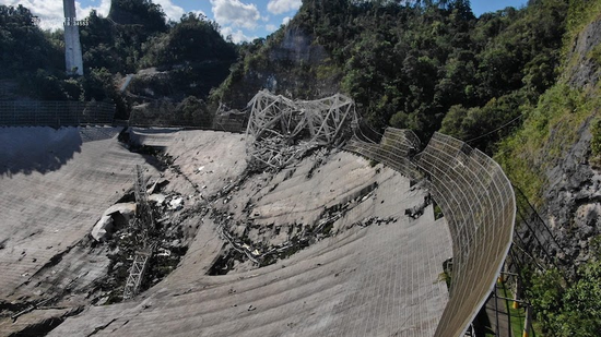 阿雷西博望远镜馈源平台掉落砸到主反射面。可以看到主反射面边缘的“面板”是网状的,和中间的面板不一样。这部分“面板”并不用以汇聚电磁波,不计算在望远镜口径之内。对比图2会发现,外沿这圈网状“面板”原本是没有的。
