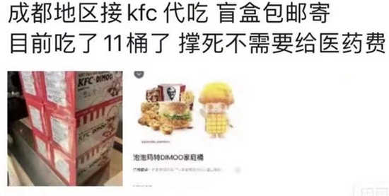 “接代吃!吃归我,娃归你”“我吃套餐,你拿盲盒”在某二手平台上,肯德基代吃的服务,单个套餐收费20到99元不等,6个套餐收费450元。