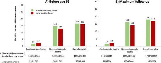 根据这项研究结果,我们能够得出,在欧洲国家中,长时间工作与糖尿病、细菌感染、心血管死亡等不良健康结果之间具有相关性,但总体来说相对温和,且与全因死亡无关。