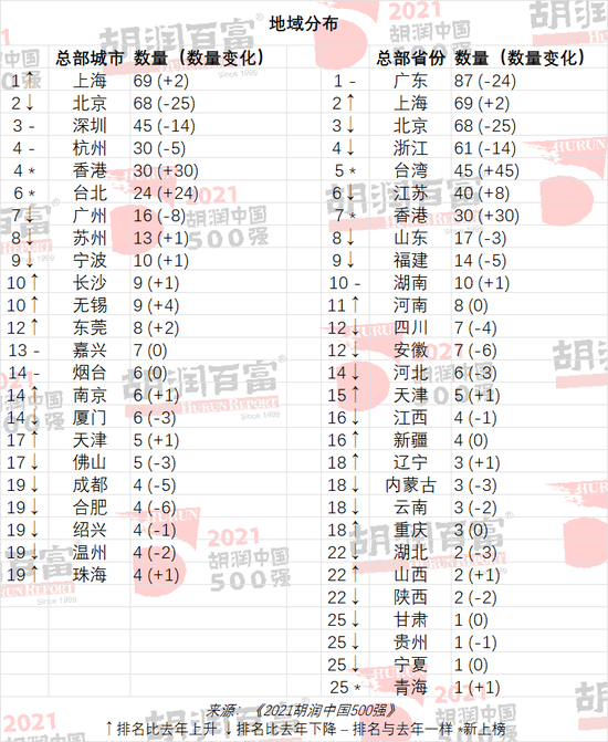 上海增加2家至69家,超越北京成为500强企业最多的城市;北京减少25家至68家,位列第二;深圳以45家保持第三,杭州和香港各30家,台北24家。一半500强企业集中在“上北深港杭台”这六大城市。