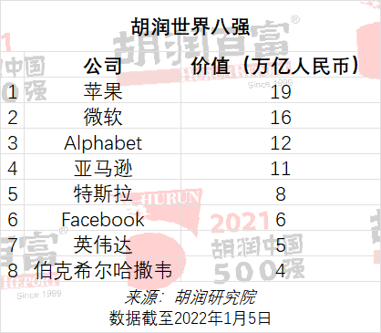 2021年8月,胡润研究院发布《2021嘉兴·胡润世界500强》,列出了世界500强非国有企业,按照企业市值或估值进行排名。苹果公司以15.8万亿价值蝉联榜首。微软、亚马逊和Alphabet位列第二至第四。47家中国上榜企业总价值36万亿。