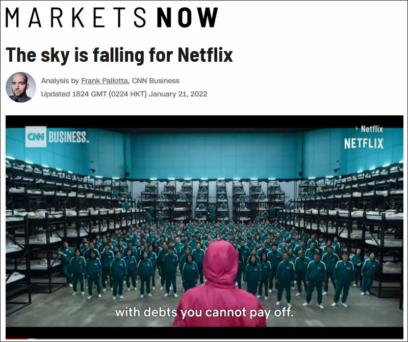“正如该公司热播新剧‘不要抬头’演的那样”,CNN写道,“奈飞的天塌了”。美国流媒体巨头奈飞(Netflix)周五收盘暴跌21.79%,股价报397.5美元。该公司在周四盘后公布的四季度财报显示,订阅用户增长250万放缓,大幅不及市场预期的增加626万,2021年同期为增加398万,多家投行下调其目标股价。