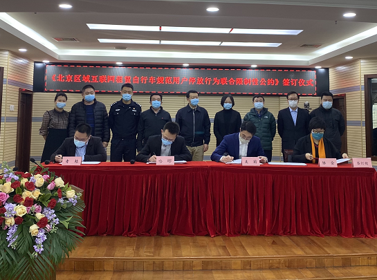 1月26日,由北京市自行车电动车行业协会牵头,会同北京摩拜科技有限公司(美团单车)、上海钧正网络科技有限公司(哈啰单车)、广州骑安科技有限公司(青桔单车)三家共享单车运营企业,四方共同签署了《北京区域互联网租赁自行车行业规范用户停放行为联合限制性公约(试行)》,对存在多次违规停放共享单车等不文明行为的用户,将实施联合限制措施。