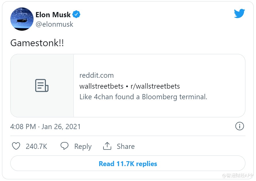 去年,一家对冲基金在游戏驿站这笔交易上几乎做的完美无缺,在10美元以下买入,并在这只股票价格达到峰值时卖出。周四,这家对冲基金Senvest Management透露,其使用的卖出信号就是特斯拉CEO马斯克的一条推文。