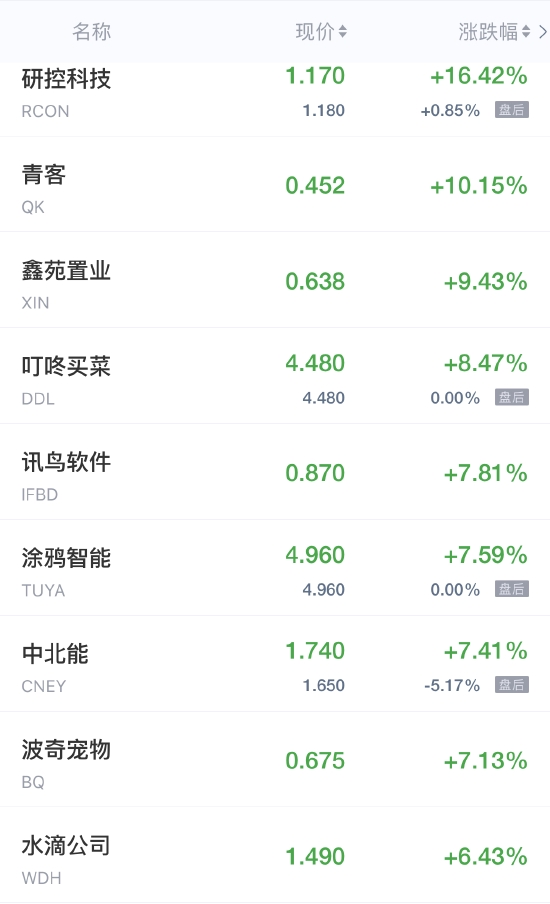 瑞幸粉单、好未来、青客涨超10%,叮咚买菜涨超8%,讯鸟软件涨近8%,涂鸦智能、波奇宠物涨超7%,水滴公司涨超6%,新东方、图森未来、第九城市涨超5%,拼多多、携程、世纪互联涨超4%,京东、一起教育涨近4%,高途、中网载线、途牛涨超3%,贝壳、爱奇艺、猎豹移动、欢聚集团涨超2%,网易、百度、富途控股、迅雷涨近2%,知乎、网易有道、老虎证券、房天下、人人公司、汽车之家涨超1%,哔哩哔哩涨近1%。