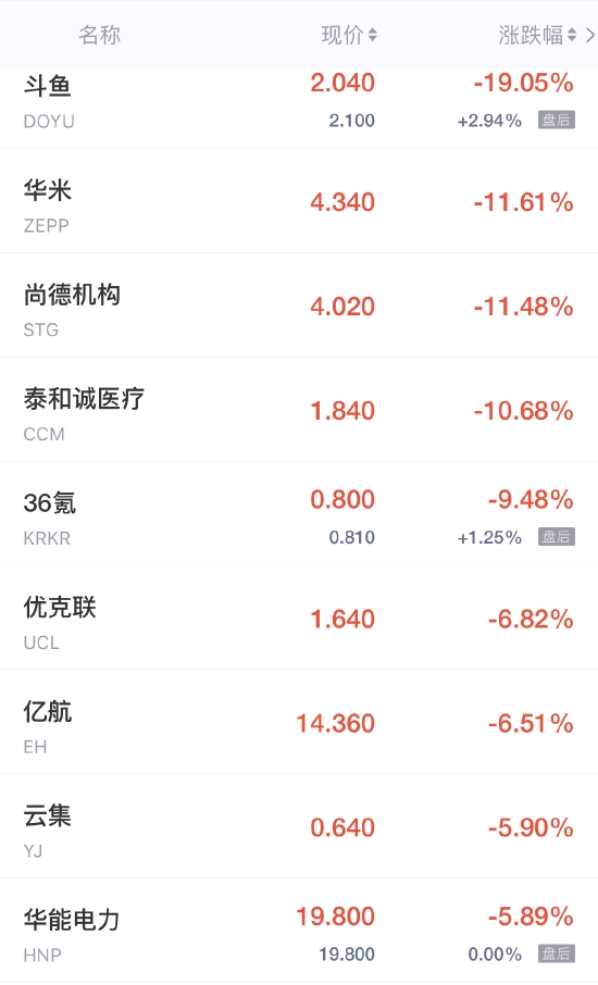斗鱼跌超19%,尚德机构跌超11%,36氪跌超9%,亿航跌超6%,云集跌近6%,虎牙、金山云、云米科技跌超5%,趣头条跌近3%,雾芯科技、凤凰新媒体、UT斯达康跌超2%,前程无忧、乐居、微美全息跌超1%。