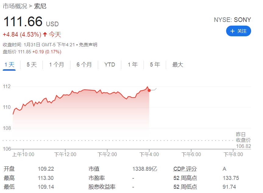 索尼ADR(SONY)周一因发布该消息盘中停牌,停牌前涨幅4.56%;盘中恢复交易后,涨幅一度超过6.04%;截止收盘索尼收涨4.53%报111.66美元,年初至今累计跌幅达11.57%。