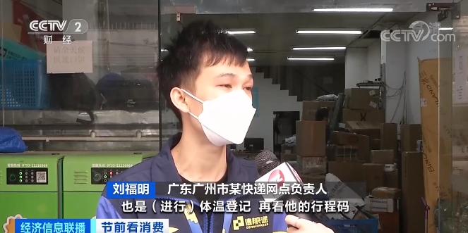 广东广州市某快递网点负责人 刘福明:国际件有专门的人员派送,这些国际件派送人员每一周都要进行核酸检测,每天上班前第一时间体温登记,然后看他的行程码