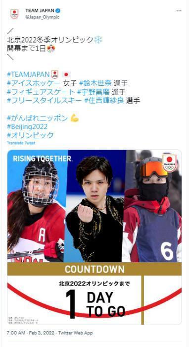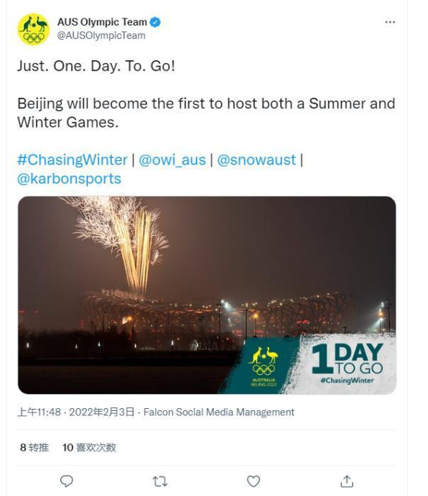 2月3日,澳大利亚代表团在推特发文,表示“冬奥倒计时1天,北京将成首个‘双奥之城’。”