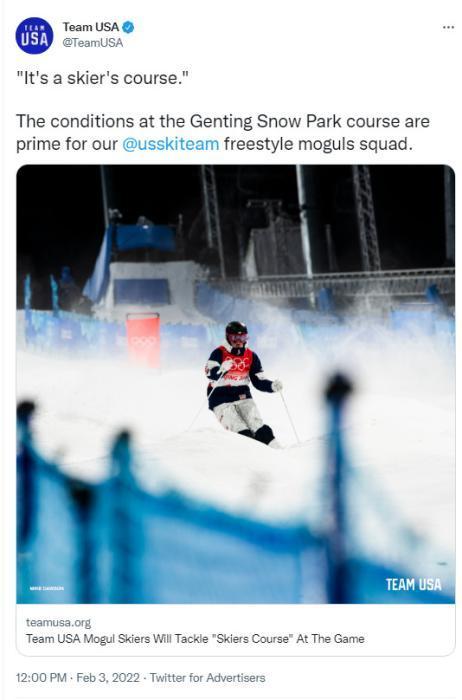 美国滑雪运动员也对位于张家口的云顶滑雪公园赞不绝口,美国代表团官方推特账号发文,称赞该公园对于美国自由式滑雪队员来说,是“绝佳的”(prime)。