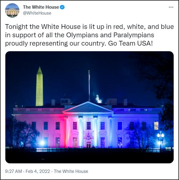 晚上9点半,白宫官方推特账号更新称,“今夜白宫亮起红白蓝灯光,为所有代表国家的奥运会和残奥会健儿加油。美国队加油!”