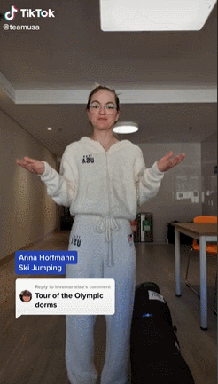 最近,美国奥运代表团的官方TikTok账号@TeamUSA密集更新运动员动态,以及奥运场馆、奥运村的景象。2月2日,美国跳台滑雪运动员安娜·霍夫曼(Anna Hoffmann)带关注者参观了精致大气的奥运村宿舍。