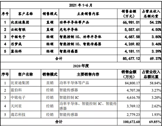 此外,自2020年分拆开始,比亚迪半导体就有意去“比亚迪”,但如今来看,这个策略并不顺利。根据比亚迪半导体此前的招股书披露的信息,截止到目前比亚迪集团仍然是其最大客户。比亚迪半导体在2018年、2019年、2020年、2021年上半年对比亚迪集团的关联销售金额分别为9.1亿元、6亿元、8.51亿元、6.7亿元,营收占比分别为67.88%、54.86%、59.02%、54.24%,可见就算最后成功IPO,比亚迪半导体短时间之内依然无法脱离比亚迪汽车独立生存。