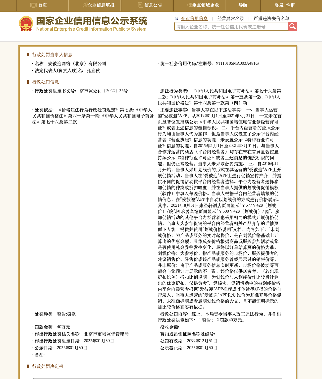 近日,Airbnb中国关联公司安彼迎网络(北京)有限公司因采用划线价的形式开展促销时,未准确表明划线价格的含义,又不能证明标示的被比较价格真实有依据,且未在“爱彼迎”APP首页显著位置持续公示业务相关的证照信息,被北京市市场监督管理局作出警告、罚款40万元的行政处罚。