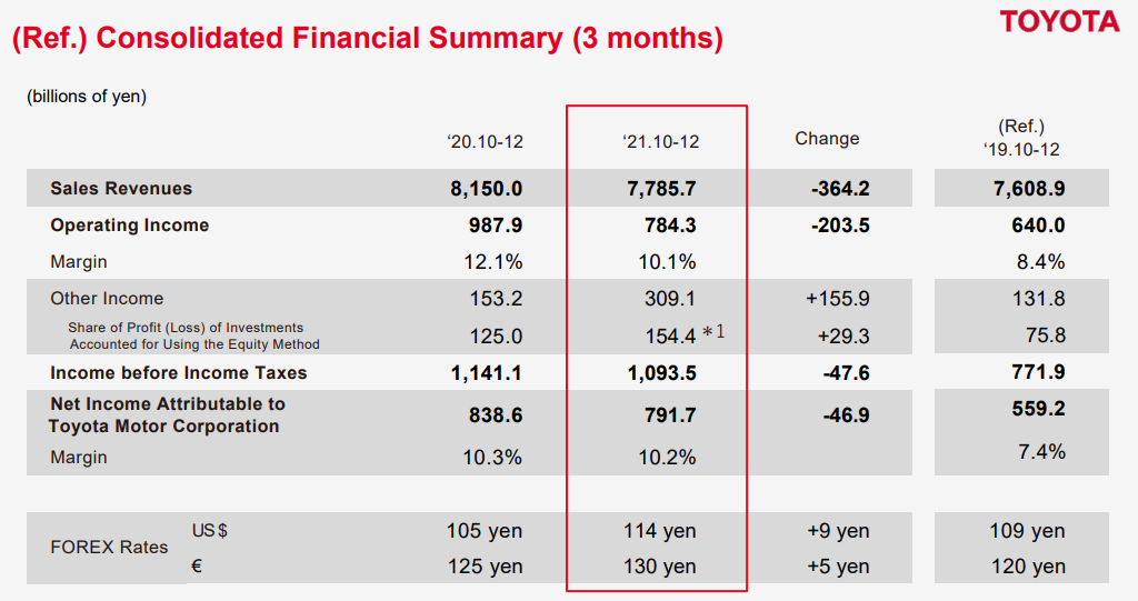 全球最大汽车制造商丰田汽车三季度经营利润同比下跌21%不及预期。受芯片短缺和疫情影响,公司同时下调全年汽车产量目标,预计芯片供应不平衡不会很快得到解决。财报数据显示,丰田汽车2022财年第三季度经营利润7843.7亿日元(约合68亿美元),同比下跌21%,市场预估7493.6亿日元;