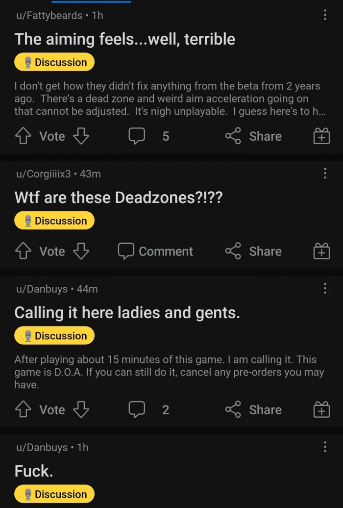 下图中网友吐槽游戏的射击手感很差,“我不明白为什么他们不修复2年前BETA时的任何内容。有盲区,还有奇怪的瞄准加速问题,根本调不过来。”