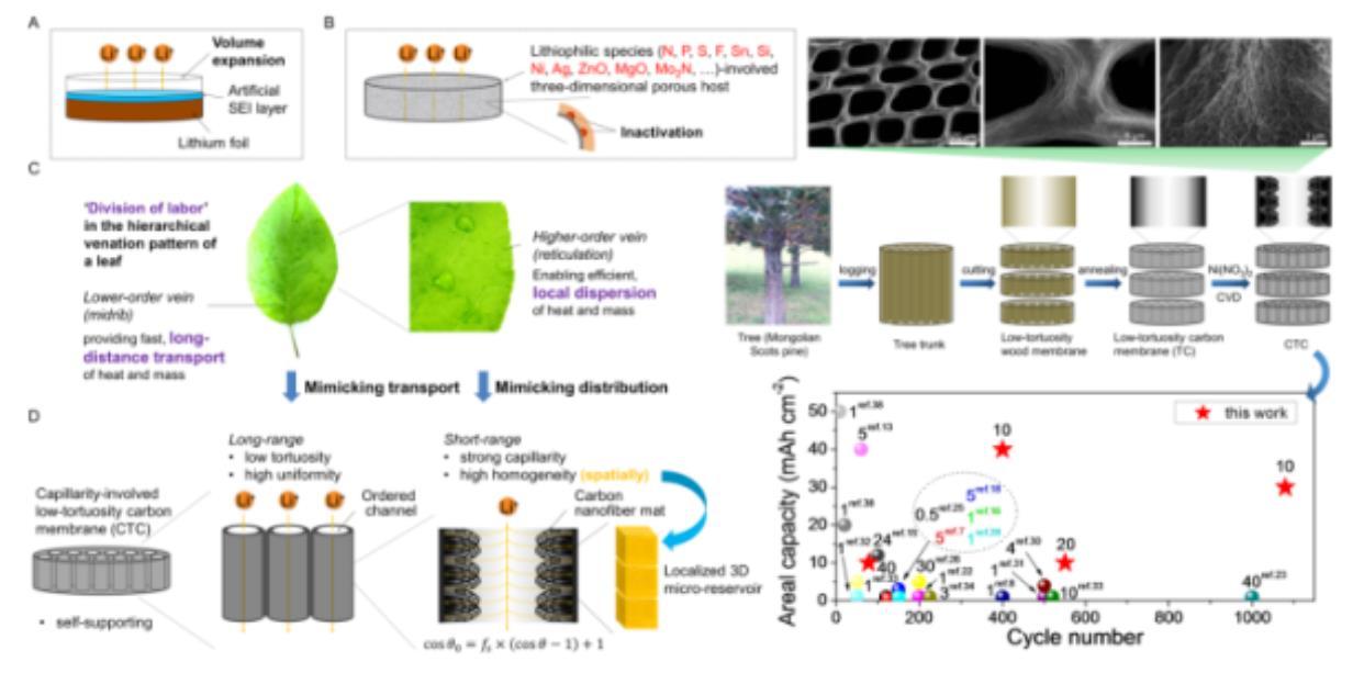据悉,该三维宿主材料模仿叶脉中的“协作分工”,一方面,低迂曲度碳质微沟道不仅可容纳充放电过程中的体积变化,还提供长程范围内锂离子的均匀、直接和快速输运通道;另一方面,均匀覆盖的碳纳米纤维网络通过强的毛细作用提高电解液亲和力,从而作为局部储液池,促进锂离子在短程范围内的均匀分布和沉积。