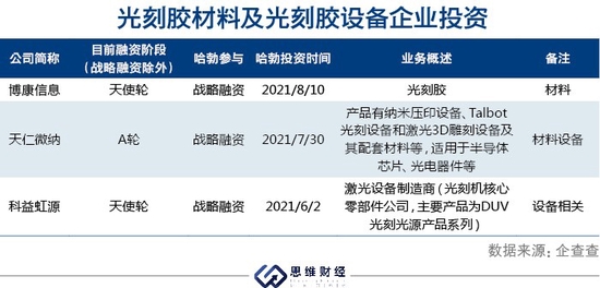 就如同一盘棋局,下棋者必得在关键处落子,才能稳占优势。华为深谙此道,也在积极布局光刻胶和光刻机相关产业。光刻胶材料领域,华为哈勃入股光刻胶单体产业化生产商博康信息;光刻机设备领域,华为哈勃投资的天仁微纳拥有Talbot光刻设备,科益虹源则是光刻机核心零部件公司。