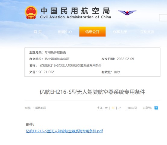 2022年2月22日,中国民航局正式发布了《亿航EH216-S型无人驾驶航空器系统专用条件》,作为开展亿航智能(EH.US)旗下自动驾驶飞行器亿航EH216-S型号合格审定工作的审定基础。《专用条件》确定了适用其具体设计和预期用途且具有可接受安全水平的适航要求,预期在低空隔离空域飞行,主要用于城市空中交通(UAM)环境的商业载客运行。