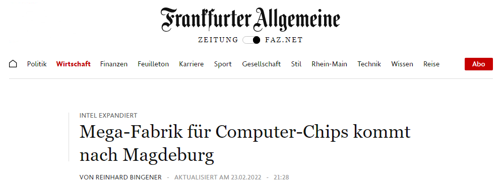 当地时间2月23日,德国媒体《法兰克福汇报》发文称,Intel已经敲定将在该国萨克森-安哈尔特州首府马格德堡,建设其新晶圆厂。这家大型晶圆厂将由八家工厂组成,占地规模约等于500个足球场,总投资将达到800亿欧元(约合人民币5738亿)左右,并为马格德堡地区提供约20000个工作岗位。