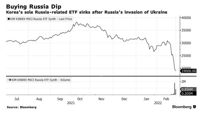 此前,由于俄罗斯入侵乌克兰扰乱了全球金融市场,这只2017年上市的ETF在上周暴跌35%。该基金运营商Korea Investment Management Co.发出警告表示,投资者需保持谨慎,并称上周五该ETF的净资产价值与其市场价格之间的差异率高于12%,这可能会使投资者面临亏损风险。