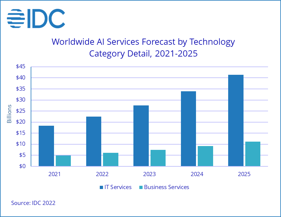 在人工智能服务分支,人工智能 IT 服务在2021年上半年实现了20.4%的同比增长,全球支出达到184亿美元。预计这一数字将在2022年提高到22%,并在预测期结束时保持不变。人工智能商业服务在增长方面也不甘落后,五年复合年增长率为21.9%。到2025年,预计整体 AI 服务支出将达到526亿美元。
