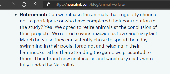 对于预定实验期结束的动物,即使它们在期间没有参与实验,Neuralink 都会将其人道放归。特别是对于猕猴,该公司会自己出资修建保护区用于放归。