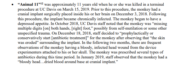 “由于接受了高度侵入性的脑部设备植入,以及没有得到适当的动物护理,许多(甚至可能是所有)的猴子都经历了极大的痛苦,”PCRM 在提交给农业部的文件中写道,