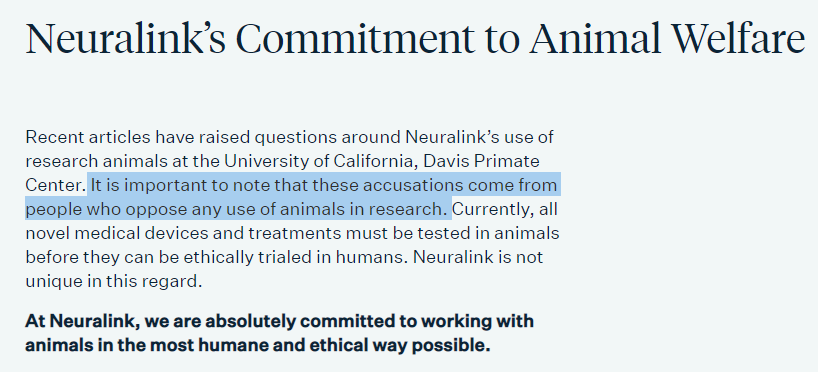 在文章开头的第二句,Neuralink 就直接指出了整个质疑的最大漏洞:对方是极端动保。