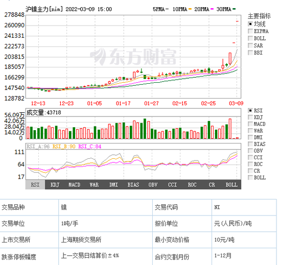 截至北京时间3月9日下午3点收盘时,上海期货交易所的沪镍主力合约再度一字涨停,报收于267700元/吨,涨幅为17%,上涨38890元/吨。