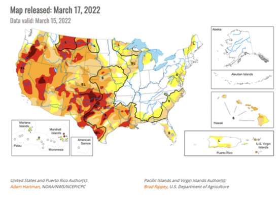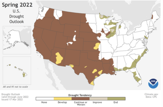 目前看来这一情况未出现好转。随着北半球进入春季,美国60%左右的大陆地区可能将迎来干旱甚至是极度干旱。