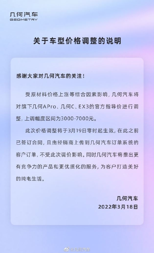 北京时间3月21日上午消息,近日,几何汽车宣布,受原材等综合因素影响,将对旗下几何A Pro、几何C、EX3的官方指导价进行调整,上调幅度区间为3000-7000元。此次价格调整将于3月19日零时起生效,在此之前已经签订合同,且由经销商上传到几何汽车订单系统的客户订单,不受此次价格调整影响。