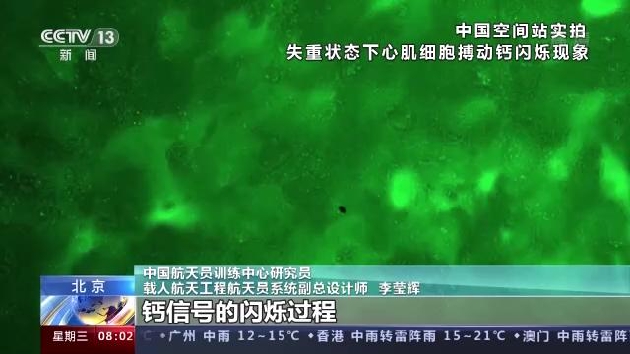 中国航天员训练中心研究员 载人航天工程航天员系统副总设计师 李莹辉:我们完成了国际上首例从人体尿液中的肾上皮细胞,通过基因重编程的方式,把它转化成生机勃勃的、具有多种功能的干细胞,又分化成为心肌细胞。通过基因编辑技术编辑了一个荧光蛋白,那么通过荧光蛋白的荧光,我们就看到在收缩过程中钙信号的闪烁过程,这也是国际上第一次看到了心肌细胞(在失重环境下)美丽的收缩过程。