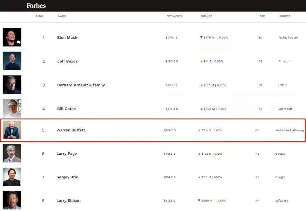 相比之下,世界首富马斯克的身价年内一度缩水620亿美元,比尔·盖茨的最高损失也一度超过125亿美元。很显然,除了自身身家的暴涨,巴菲特跻身全球富豪第五位还得益于其他超级富豪的财富缩水。