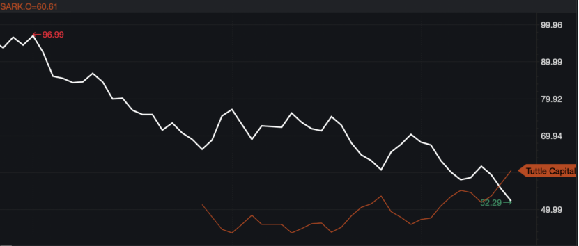 自今年2月以来,SARK的最大涨幅已超过43%,而ARKK年内的最大跌幅一度超44.7%。