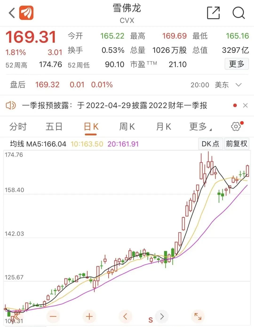 进入2022年,国际原油价格一路飙涨,雪佛龙股价也随之一路飞涨。从最低116.07美元飙至最高174美元,年内最大涨幅接近50%,总市值增长超过1000亿美元。
