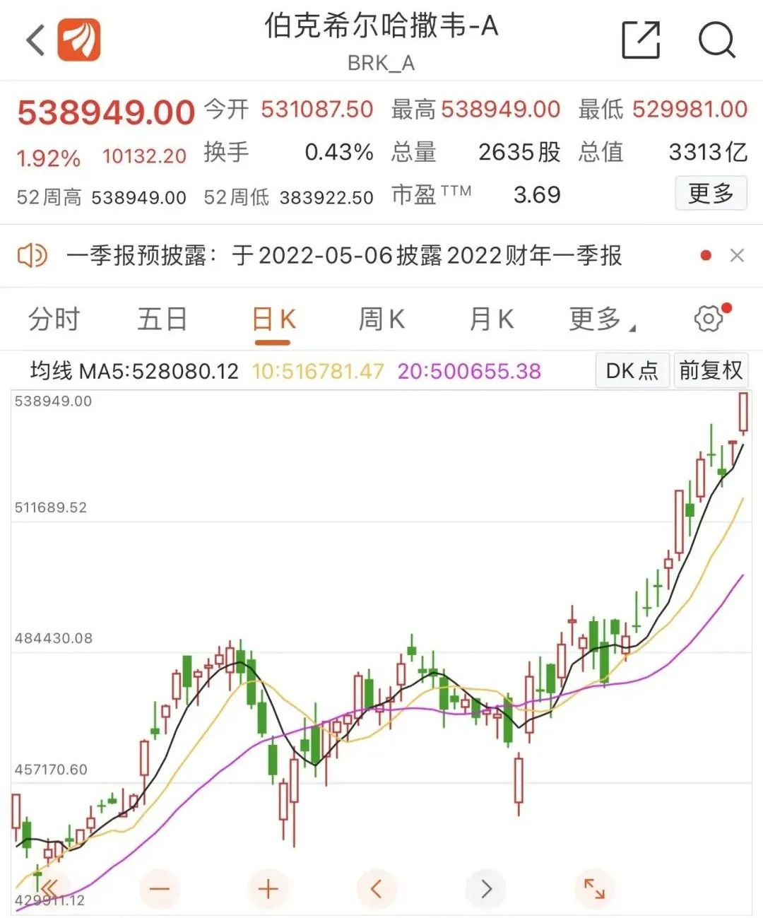 反观巴菲特执掌的伯克希尔哈撒韦,在年内的表现却非常稳健。3月25日收盘,伯克希尔哈撒韦A类股股价再度逆势创出历史新高,股价一度逼近54万美元/股的大关。截至最新收盘,伯克希尔的年内累计涨幅达19.6%,大幅跑赢了美股大盘,总市值已经接近8000亿美元。