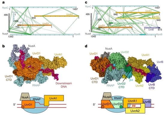 研究得出的新模型表明,RNA聚合酶是核苷酸切除修复复合物的组装支架,也是在整个基因组中读取DNA损伤的主要传感器。结果显示,核苷酸切除修复主要的两种酶UvrA和UvrD不能自行定位大多数DNA病变,而是通过与RNA聚合酶持续关联,进行监测和修复启动。