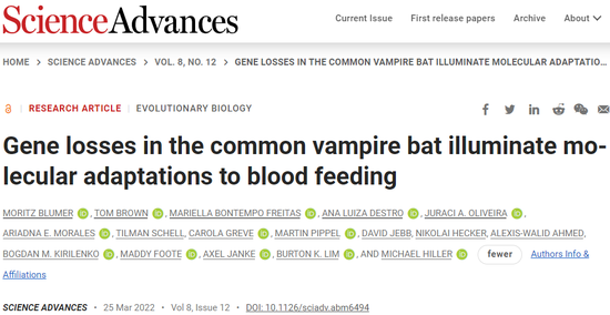 [1] Moritz Blumer et al。 Gene losses in the common vampire bat illuminate molecular adaptations to blood feeding。 Science Advances (2022)。 DOI: 10.1126/sciadv.abm6494