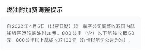 据央广网报道,同程旅行接到海南航空、大新华航空等航司通知,自2022年4月5日起,调整燃油附加费收取标准。具体来看,国内航线燃油附加费收取标准:800公里(含)以下航段,每位旅客收取人民币50元;800公里以上航段,每位旅客收取人民币100元。